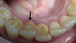 Tandsteen is een verharde laag tandplak die bestaat uit een mineralenlaag. Het uit zich meestal als een gele of bruine kleur op de tanden.